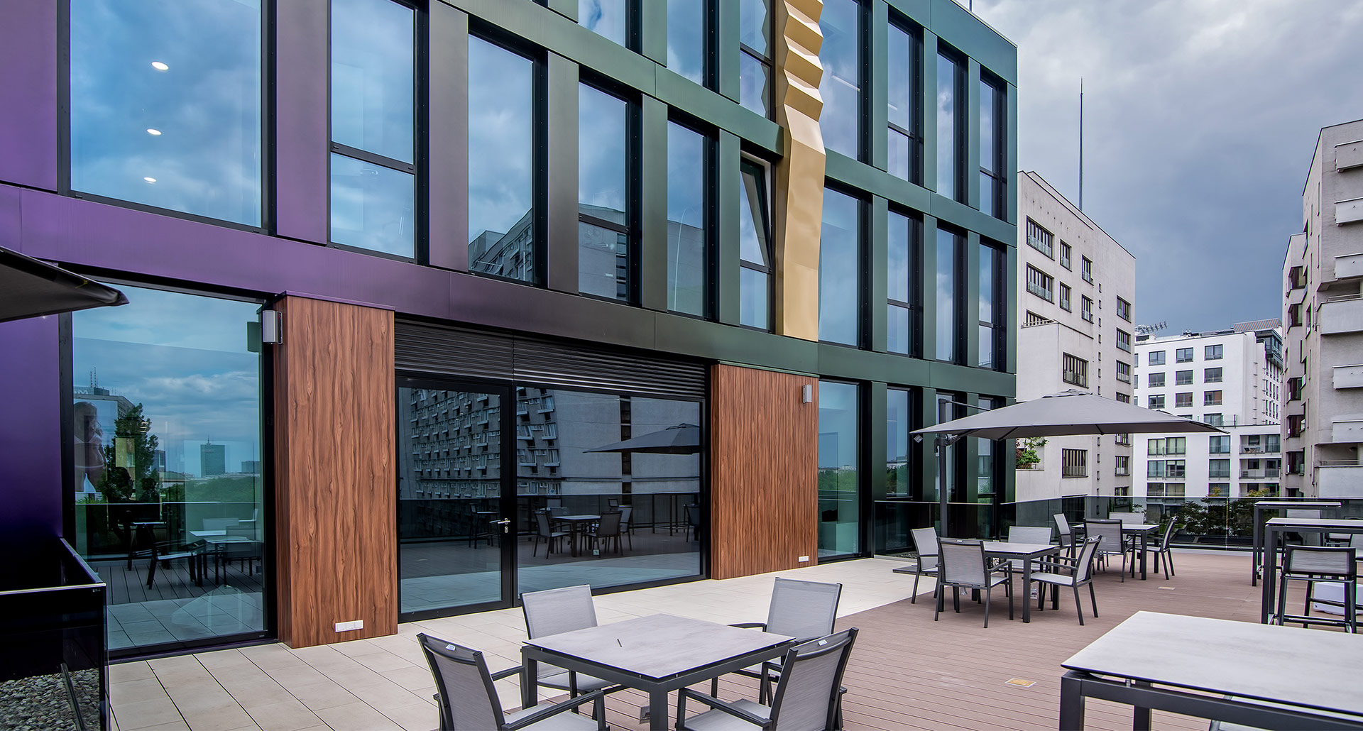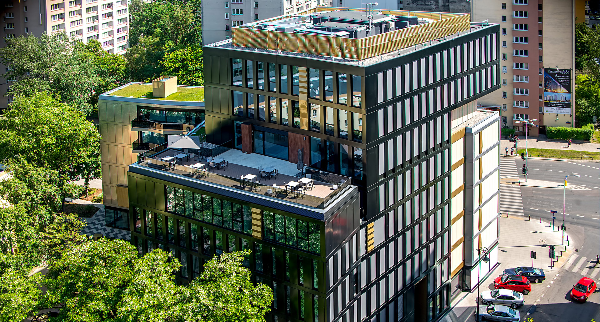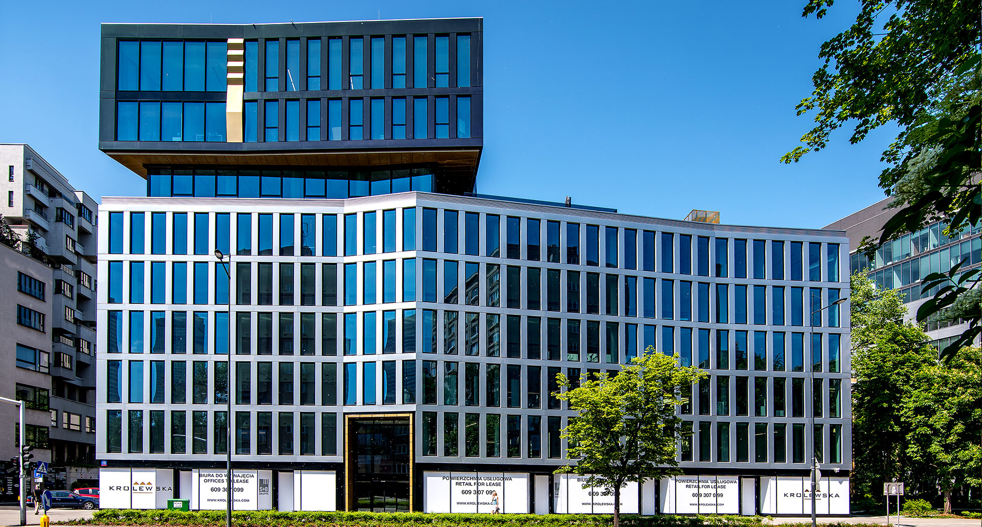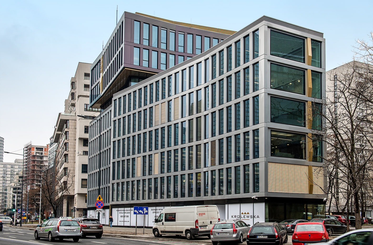 Zewn?trzna kompozycja 8-kondygnacyjnego budynku biurowego zaznaczona jest wyra?n? fasad? architektoniczno-rze?biarsk? utworzon? przez pionowe rastry z oknami od poziomu pod?ogi a? do sufitu. Od 1 do 6 pi?tra budynek b?dzie dysponowa? tarasami. Z najwi?kszego tarasu na 6 pi?trze b?d? mogli korzysta? wszyscy Najemcy budynku KróLEWska.